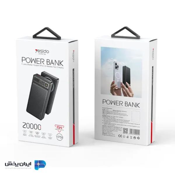پاوربانک Yesido YP58 با ظرفیت ۲۰٬۰۰۰ میلیآمپر ساعت و ویژگیهایی مانند شارژ سریع، شارژ بیسیم مغناطیسی ۱۵ وات و پشتیبانی از شارژ همزمان ۳ دستگاه، گزینهای ایدهآل برای افرادی است که به دنبال یک دستگاه قابل حمل با عملکرد بالا هستند. برای خرید عمده لوازم جانبی موبایل و کامپیوتر از فروشگاه آنلاین ایران پخش میتوانید به صورت آنلاین از طریق سایت خریداری نمایید یا به صورت حضوری در دفتر مرکزی پاساژ علاالدین (تهران – خیابان جمهوری – پاساژ علاءالدین – طبقه ۴ – پلاک ۴۰۳) اقدام نمایید. تیم پشتیبانی ما در هر مرحله از خرید همراه شماست تا آسوده و با خیال راحت خرید انجام دهید.