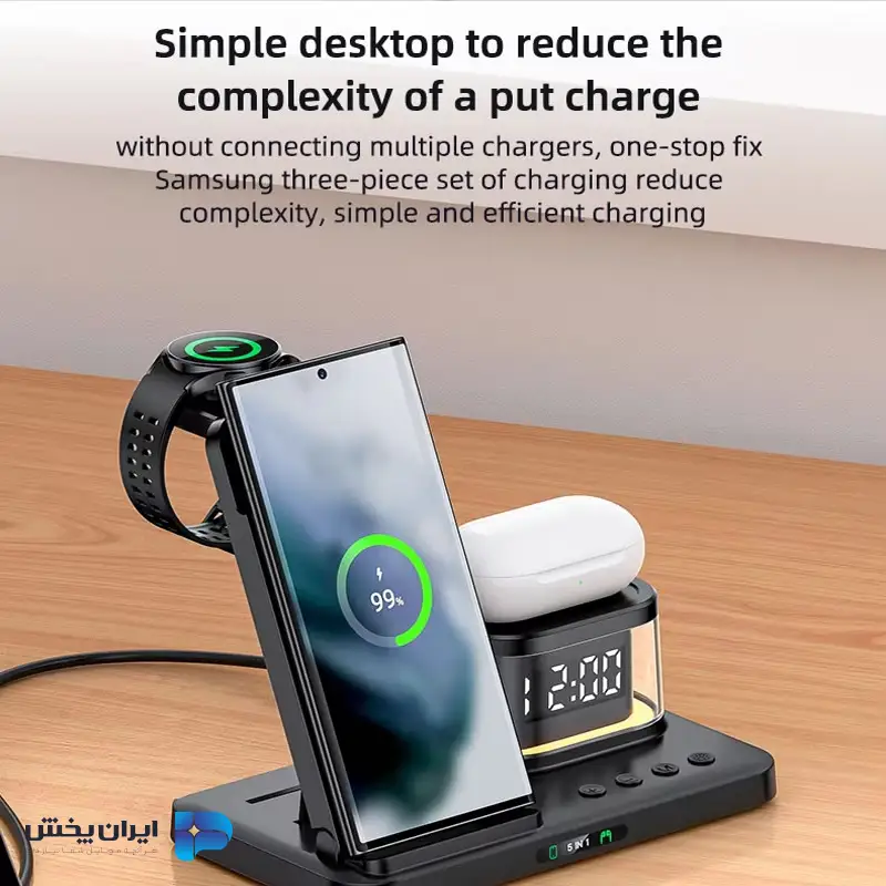 پشتیبانی از چند دستگاه: قابلیت شارژ همزمان گوشی، ساعت هوشمند، هدفون و ارائه نور محیطی.