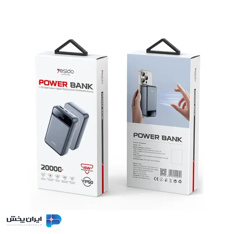 پاوربانک YP50 یسیدو با قابلیت شارژ سریع ۳۵ وات از طریق پورت PD و USB، نمایشگر LED برای نمایش وضعیت باطری و پشتیبانی از شارژ بیسیم مغناطیسی (تا ۱۵ وات) عرضه میشود. این پاوربانک یسیدو از شارژ همزمان 3 دستگاه هوشمند پشتیبانی میکند و همچنین قابلیت پشتیبانی و توانایی استفاده در پروازهای هواپیمایی را دارد و از پروتکل های فست شارژ PD/QC/SCP پشتیبانی میکند.