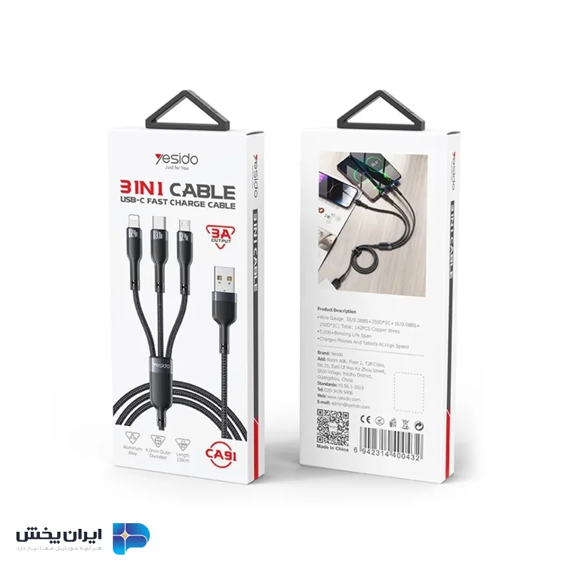 کابل چندکاره یسیدو مدل YESIDO CA91 یک کابل شارژ ۳ در ۱ است که با داشتن سه سری مختلف Type-C، Lightning و Micro USB تمام نیازهای شما برای شارژ دستگاه‌های مختلف را برطرف می‌کند. با این کابل دیگر نیازی به حمل چند کابل جداگانه ندارید و می‌توانید گوشی اندرویدی، آیفون و حتی پاوربانک یا گجت‌های قدیمی‌تر را به‌صورت هم‌زمان شارژ کنید. این کابل از جریان ۳ آمپر پشتیبانی می‌کند و قابلیت شارژ سریع (Fast Charging) برای دستگاه‌های مختلف را دارد و یکی از بهترین محصولات برند یسیدو YESIDO است. با استفاده از این کابل می‌توانید گوشی‌های اندرویدی، آیفون و حتی پاوربانک‌ها را با سرعتی مناسب شارژ کنید. خرید کابل تبدیل عمده با ویژگی ها و کاربردهایی که دارد انتخاب عالی برای افرادی است که به دنبال یک کابل چند کاره هستند. کابل چند کاره  یسیدو دارای طول استاندارد ۱.۲ متر است که برای استفاده در منزل، محل کار یا خودرو بسیار مناسب خواهد بود.